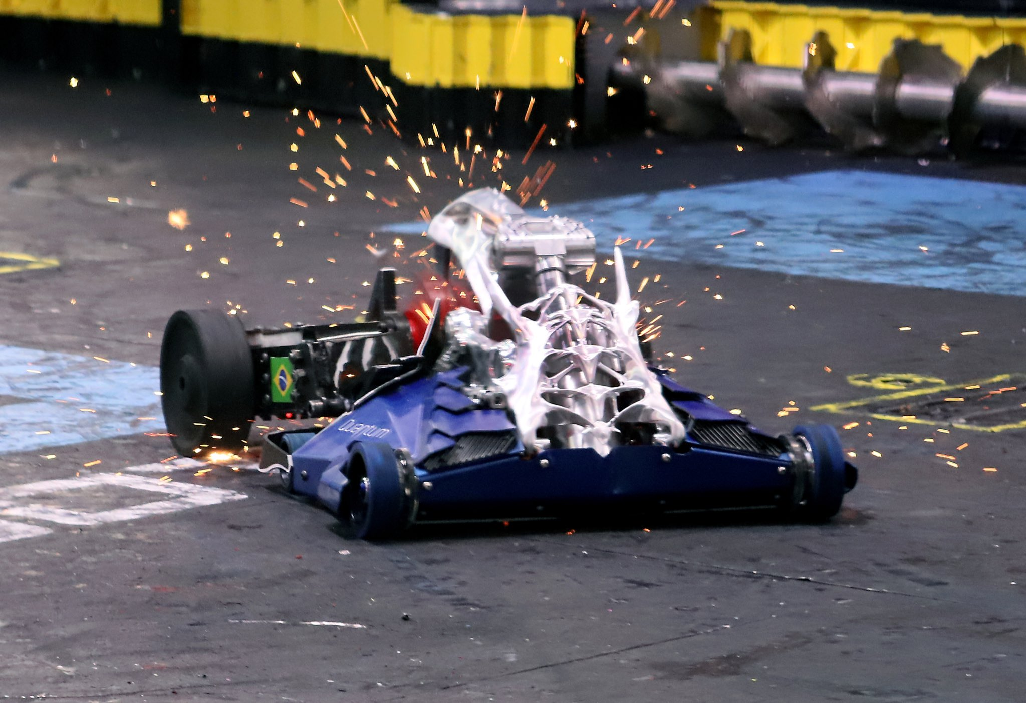 - QUANTUM v BLACK DRAGON - Black Dragon's streak of avoiding knockouts continues, but they didn't win. This season has really shown the importance of driving skills, which has been the difference-maker for bots like Huge and Claw Viper. Black Dragon doesn't have a lot of driving skill on their team; granted, they hardly need to, running such a hard-hitting and durable bot. But it was really clear here that there's not a lot of strategy to Black Dragon's approach. Quantum took its hits like a champ and maintained control throughout the fight before getting its teeth stuck in another opponent.