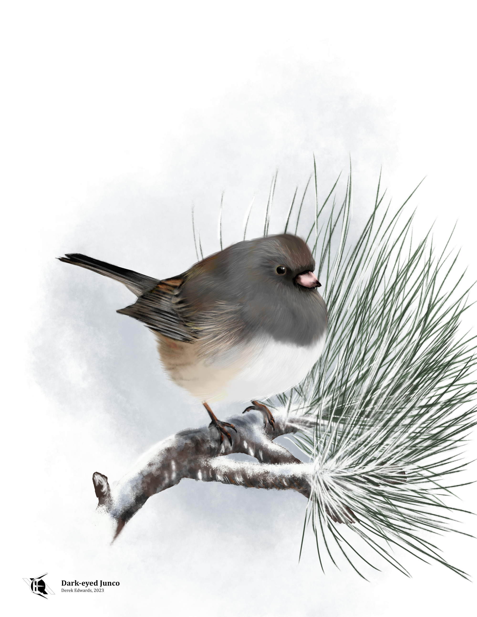 Besides those pink bills, dark-eyed juncos differ widely in appearance across locations. Here in Michigan, as well as other parts of eastern North America, they look like my drawing – slate-colored with white bellies. In the Pacific Northwest, they are a rich brown with black heads and white bellies. In the Rockies, they either look like eastern birds, but with white wing bars, or else they have pinkish-tan sides, or else yet reddish backs and gray bellies. To fully depict this species I would have had to draw at least five birds. Alden H. Miller, an ornithologist who taught at U. C. Berkely* studied juncos extensively, dividing the dark-eyed junco into fifteen subspecies, though he noted that a dozen of those would interbreed and thus produced a sort of sub-species gradient across the species' range.