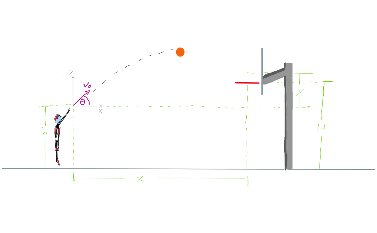 The equation is now all numbers except for 3 things, variables, that all change depending on player performance: h, depending on how high the player’s hands are; v_0, depending on how hard the player throws the ball; and θ, the upwards angle the ball is thrown at.