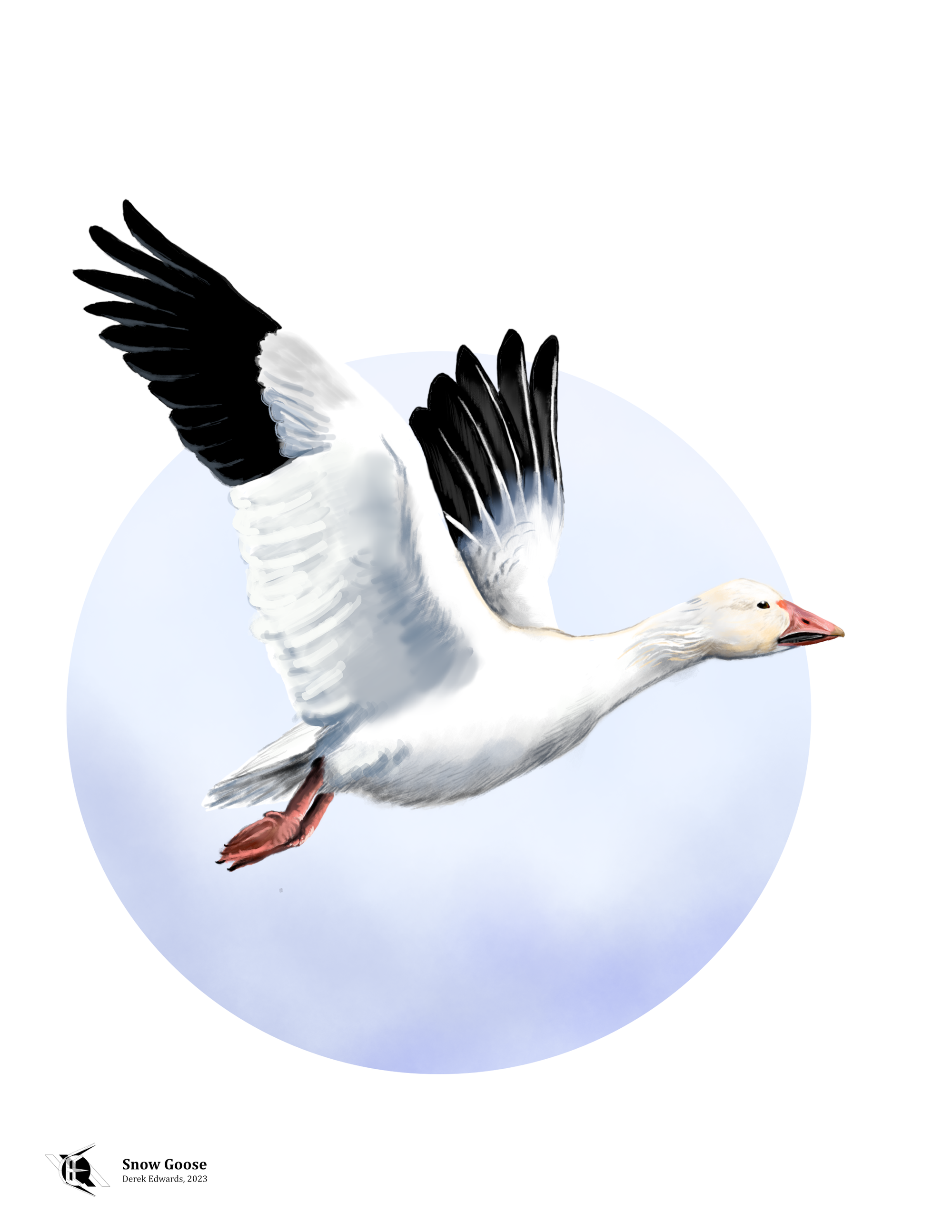 Despite their home's remoteness, snow geese have been well researched. Sometimes I struggle to find a single interesting article about the bird I draw; there's a 300+ page book about the authors' observations of snow geese nesting at the Pérouse Bay7 (the one in Manitoba, not the one in Hawai'i). And there's another book about its author's travels following the snow goose's migration.8 I didn't have the time to read these books (or the books themselves to read) but they're out there if you're interested. What interesting story I did find about the snow goose is that it was originally thought to be two different geese: the snow goose (Anser hyperboria, or the "goose from beyond the north") and the blue goose (Anser caeruleansis, or, well, the "blue goose"). The snow goose was white, while the blue goose was largely slate-gray. By the 1960s, genetic studies showed that these two geese were simply the two color morphs of the same species.9 The newly unified species kept the "snow goose" name, while the blue goose's scientific name, which was published first, is the one that lives on in ornithological use. The species does have two recognized subspecies, but they aren't distinguished by color, but by size.