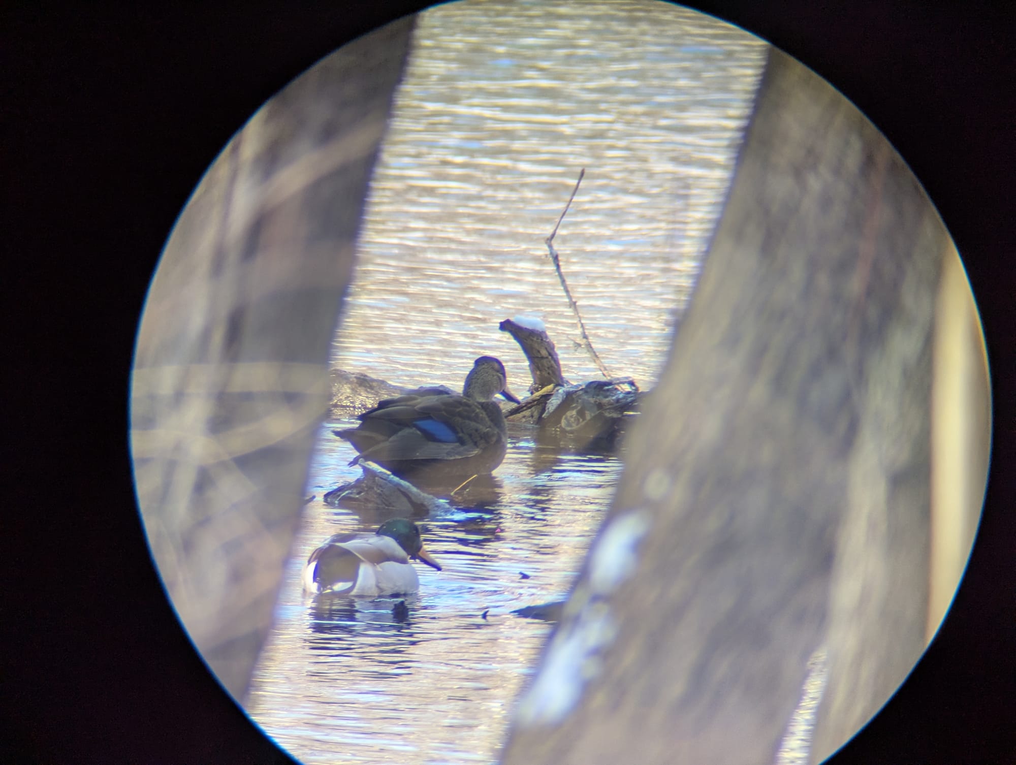 I had a great weekend of birding, including maybe the least impressive birding achievement in the world: spotting an American black duck amongst a flock of mallards. Here's a picture through my scope:
