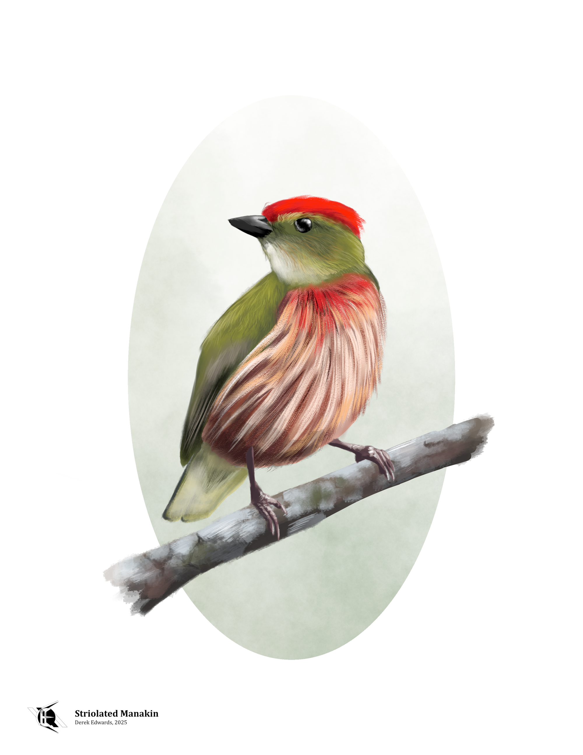 Every year, I draw a bird for Christmas that shows the Christmas colors of red and green. This past Christmas I did one better by drawing a bird with candy-cane striping, the Striolated Manakin.