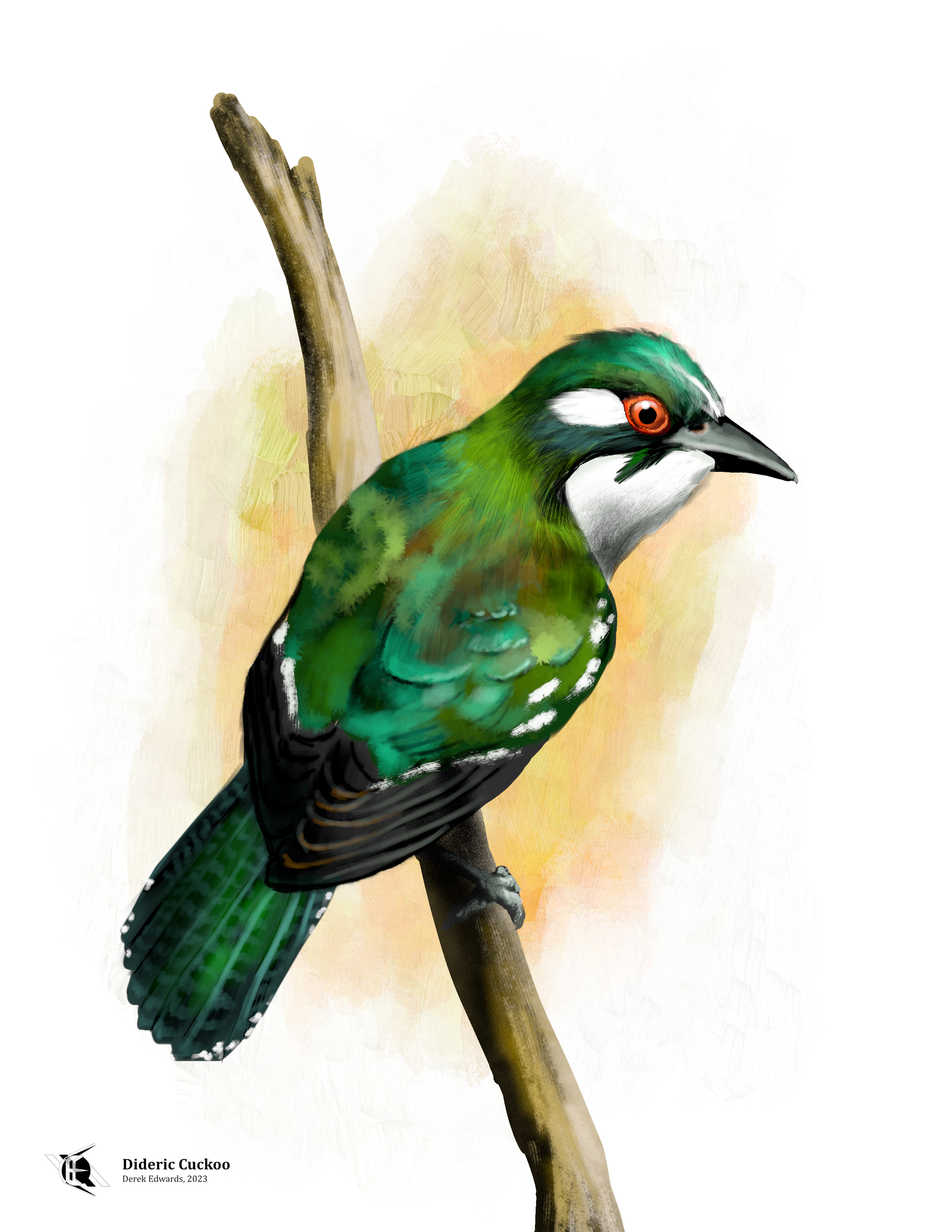This week we're going to sub-Saharan Africa to meet a bird that I have a weird sort of connection with: the Dideric Cuckoo. This is the first cuckoo we've featured so far, so let's start with going over cuckoos as a whole. Cuckoos are members of the order Cuculiformes, a mono-familial order that also includes the roadrunners, the couas, and the anis, which we might get to later. Cuckoos are found around the world, mainly in the tropics. They take their name from the common cuckoo, a Eurasian species whose two-note cooed call has been immortalized in the chime of Black Forest-made clocks.