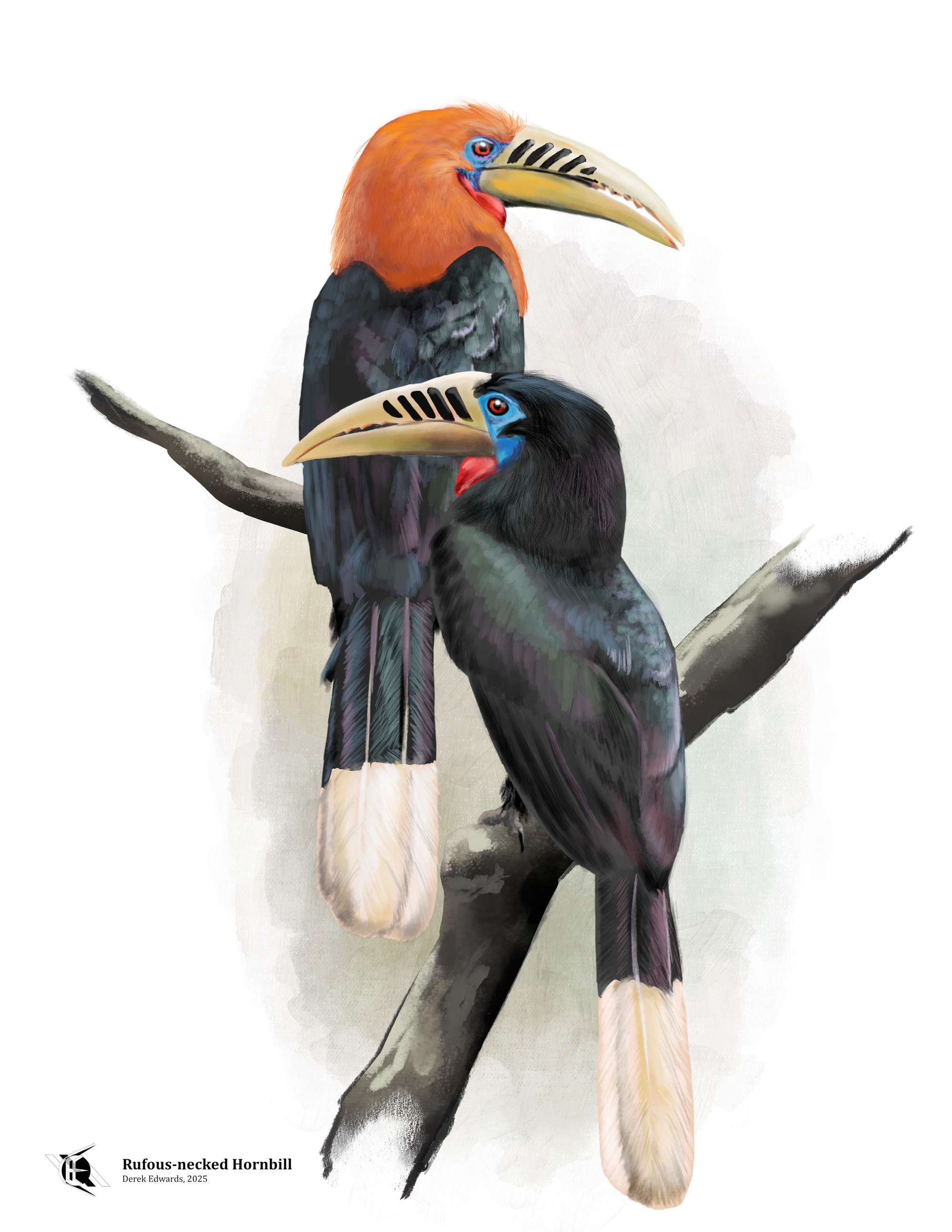 So wrote G. K. Chesterton of a hornbill — I suspect of a great hornbill, whose beak is especially large and yellow, though it could have been some other — in a scene from The Man Who Was Thursday in which his hero, Detective Syme, pursues an anarchist leader through a French zoo. The hornbill passes quickly out of the story, but it stood out to me, because at the same time I read that passage, I was actually in the process of drawing a pair of hornbills, these Rufous-necked Hornbills.