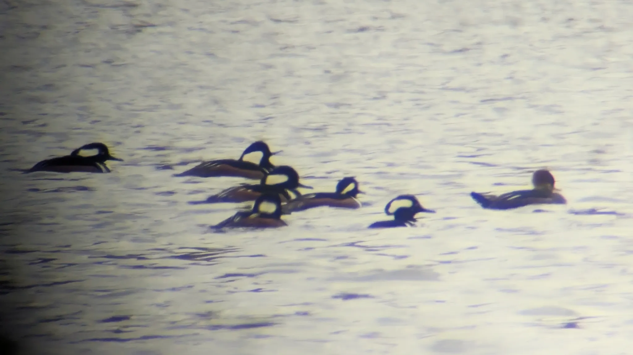 For now, I did find some hooded mergansers, about forty total, the most I’ve ever seen in one group. Here’s a photo I got through my scope of seven of them.