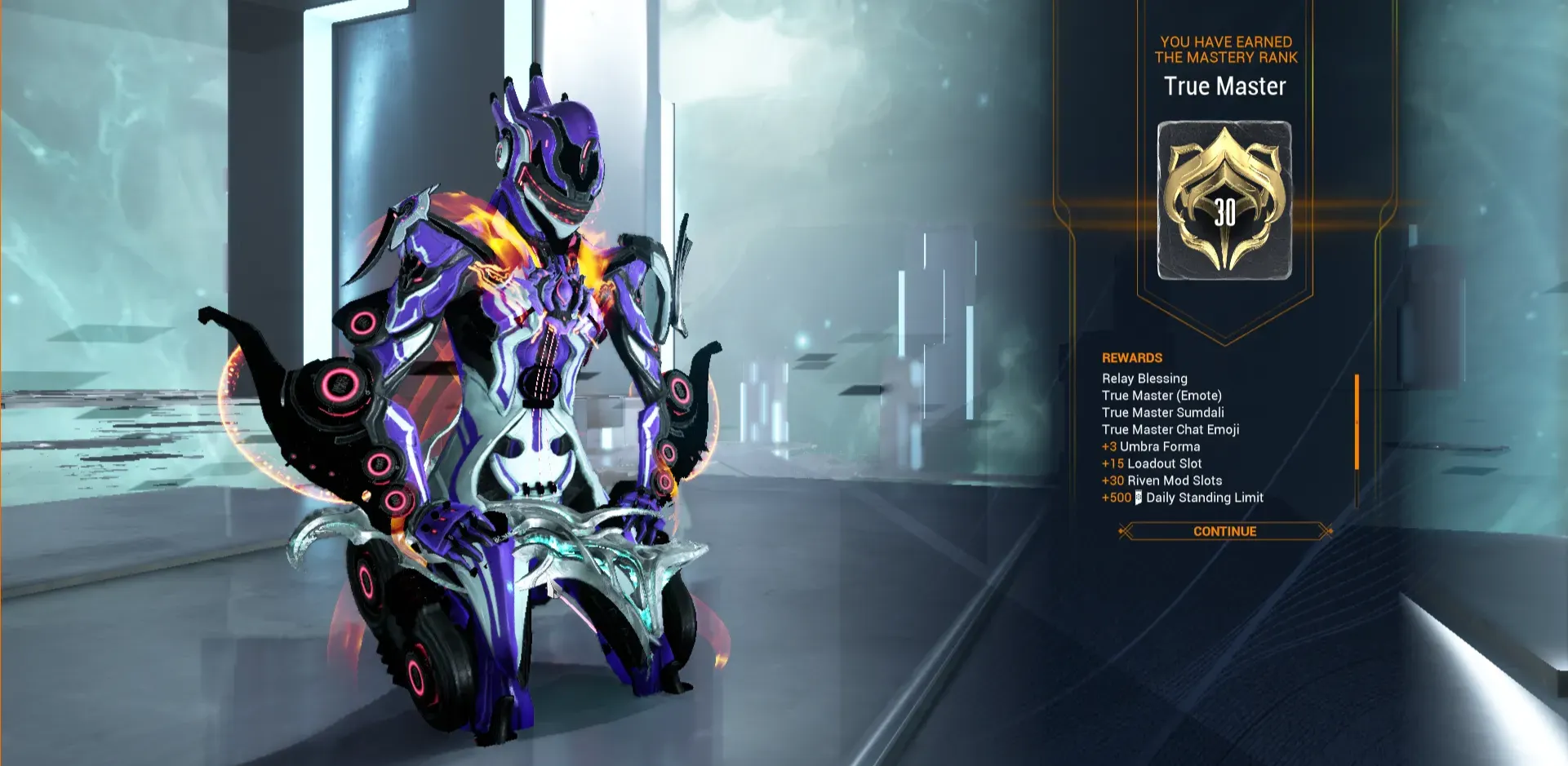 Just noting that I hit MR30 over the weekend; I’d hit MR29 a little bit ago, and I’ve since made a concerted efforts to farm and rank up through the few ‘frames I hadn’t yet (I had the primes, but not the base ‘frames for Ember, Hydroid, Nekros, and Mag) as well as a few weapons, and now I’m at MR 30, which means I never have to worry about mod capacity on new gear again, and I can provide boosters to a relay.