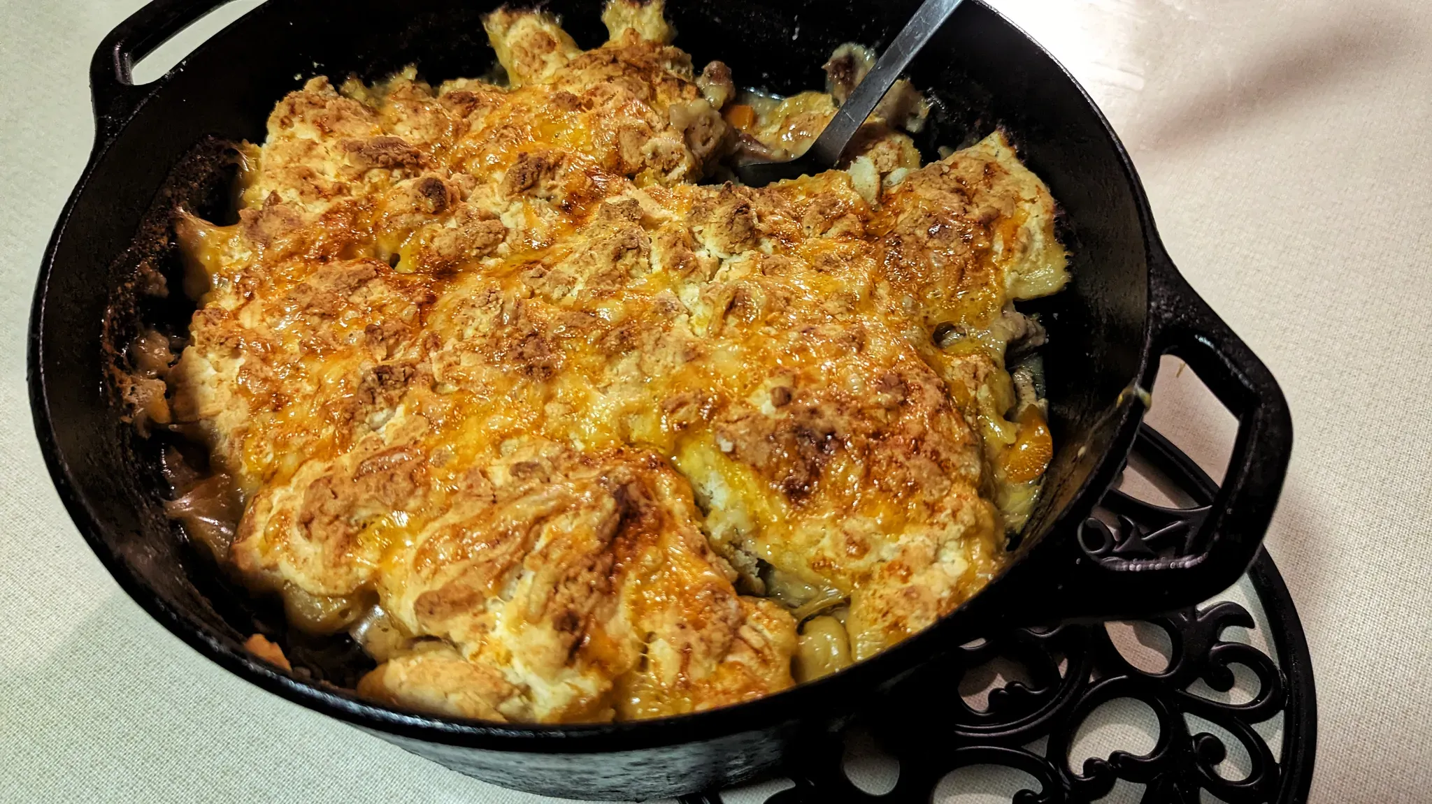 There are certain similarities between this dish and both stir-fry and biscuits and gravy. It’s not much like either of those, nor is it like a mix of those, but there are similar notes. The spiced cooked cabbage I think is the part that strikes me as Chinese-reminiscent, and all that pork and black pepper along with the biscuits obviously form the biscuits and gravy parallel.