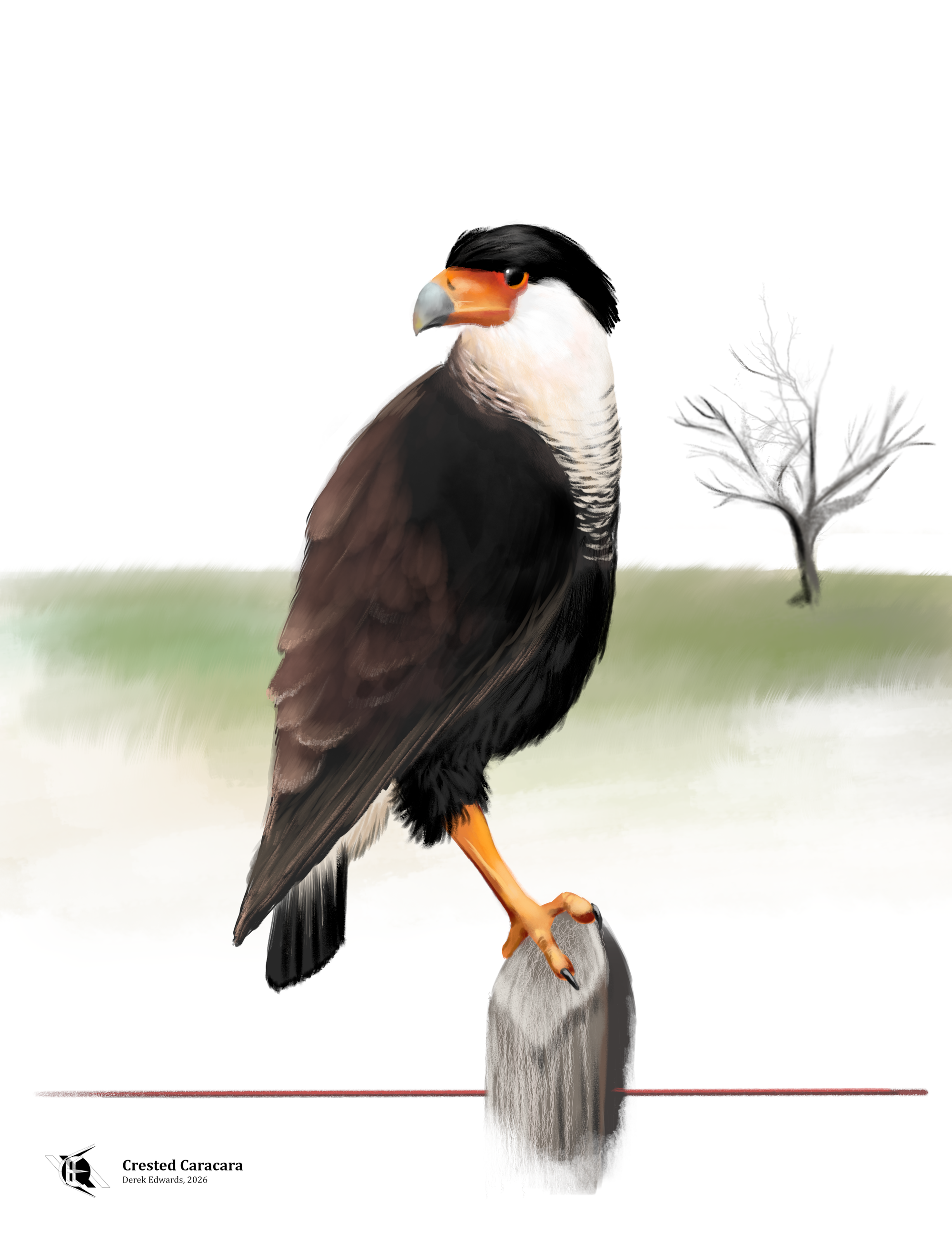 The crested caracara is, I’ve always thought, a smug‑seeming bird. It has, I realized as I drew this one, essentially the visage of a tern mapped onto a raptor’s features: down‑tipped orange beak, white face, a black cap shading into the back, an eye that disappears into the cap’s margin. The caracara has not the eagle’s fierce gaze, nor the peregrine’s swift, seeking attack. The one I and an assembled crowd of eager birders saw came gliding casually into view and went about eating from a pile of carrion without paying us much mind. It seemed unbothered by the snow, which was perhaps some of the first it had ever seen. Its nonchalance stood in contrast to us birders, who had spent an hour on a chilly roadside waiting to see it, and many of whom repositioned to a different roadside when it flew off over a low rise. Reports of that caracara on eBird peaked that day and have dwindled since. I hope this is because the bird finally left to feed back home, but for all I know it’s still there, unnoticed after all those who wanted to see it did.