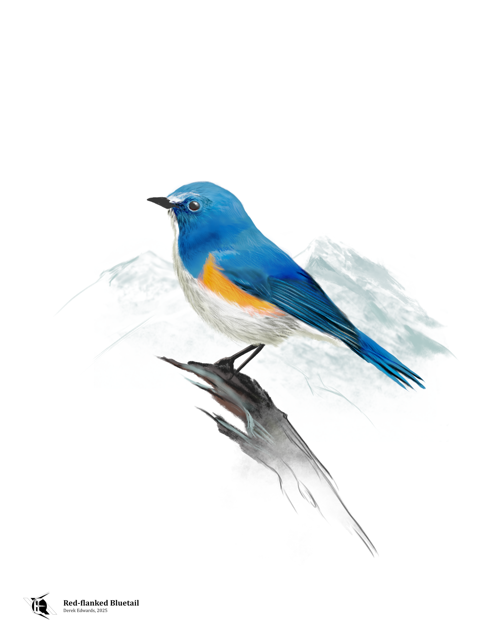 I had meant to feature this bird a few weeks ago, but then I saw my first horned larks and I drew one of them instead. As much as I try not only to draw and write about the birds I'm familiar with, I will admit that a bird I have some personal story about will get some precedent. This week's bird is not one I've seen; it is not one I'm particularly likely to see, given that it lives in Asia. But, then again, I wouldn't be the first person in my side of the world to spot a Red-flanked Bluetail.