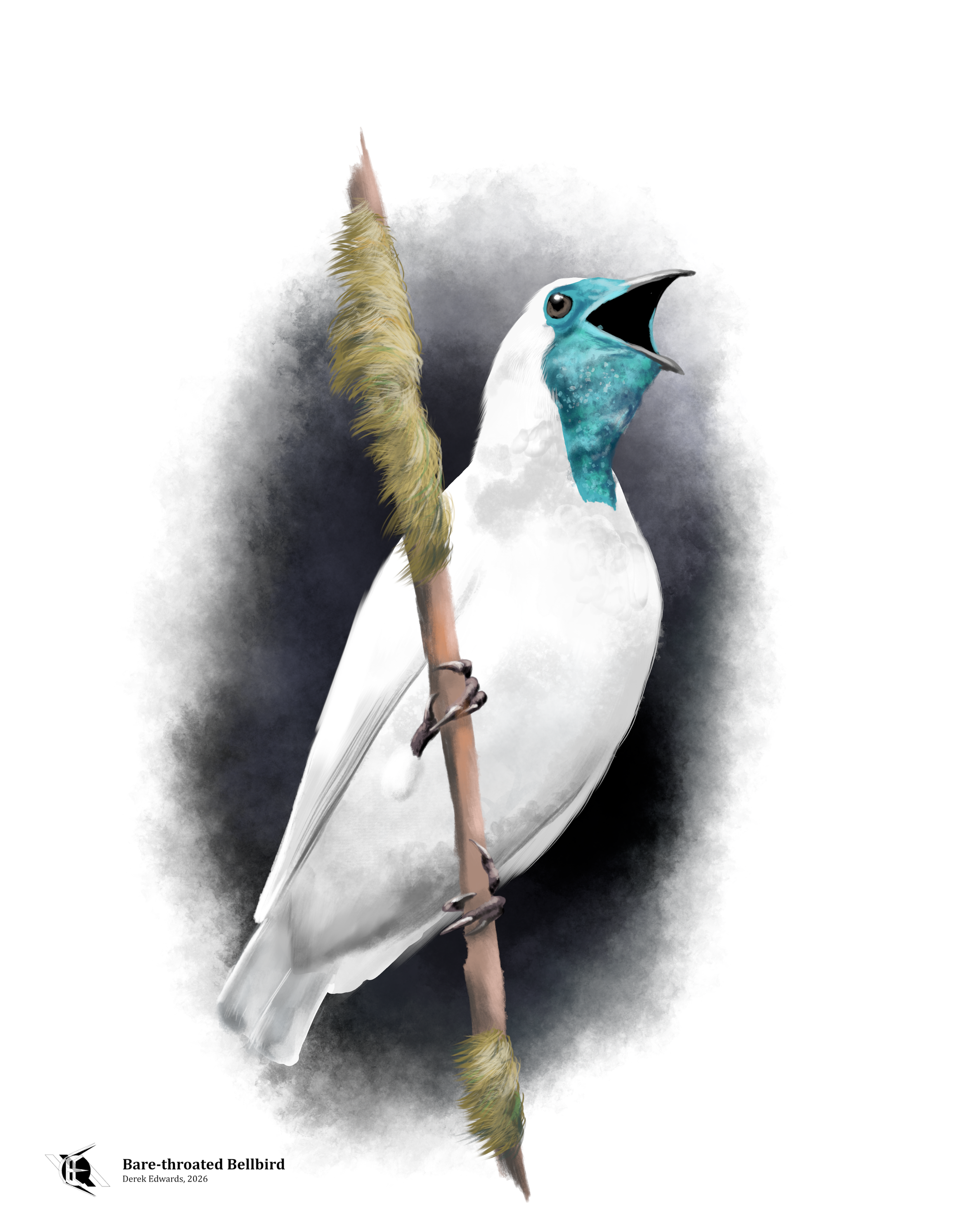 To science, the bird is Procnias nudicollis; the species name simply means “bare‑throated” in Latin, combining the roots of the English words “nude” and “collar.” The genus name recalls Procne, the Theban princess of myth who was turned into a bird, usually claimed to be a swallow. Someday I’ll draw a purple mountain someday and say more about that when I talk about the genus Procne; for now, just know that “bellbirds” were once thought to have mouths resembling those of swallows.5