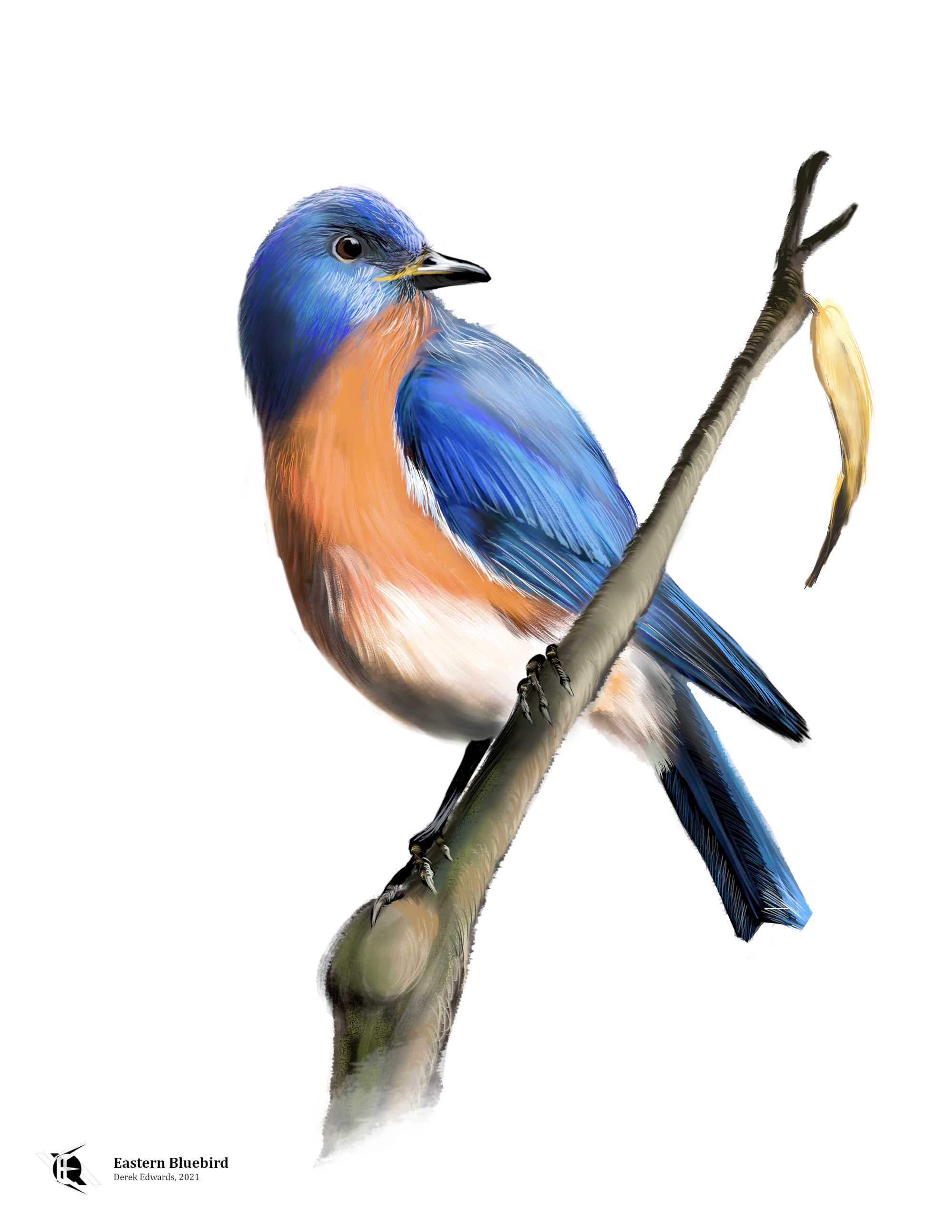 This week we have the Eastern Bluebird, a migratory thrush which is generally on everyone's list of favorite North American birds. Like their larger cousins, the American robins, these birds travel south for the winter, and have been watched for as a portent of spring for as long as humans have known of them. Unlike robins, bluebirds have not adapted to urban or suburban life. Bluebirds were most common during the early, agrarian era of American history, when the dense forests were cleared away to form fields and open clearings, these birds' favored habitat. They were the farmer's friend, eating insects found in crops. As farmland has been converted into subdivisions, and remaining farms have expanded use of pesticides, bluebirds have declined, hitting a low point around the 1970s. Additionally, the introduction of house sparrows and starlings from Europe has meant increased ecological competition for bluebirds. Still, they are common, if no longer ubiquitous, sights in the American country-side, and are not considered a threatened species.