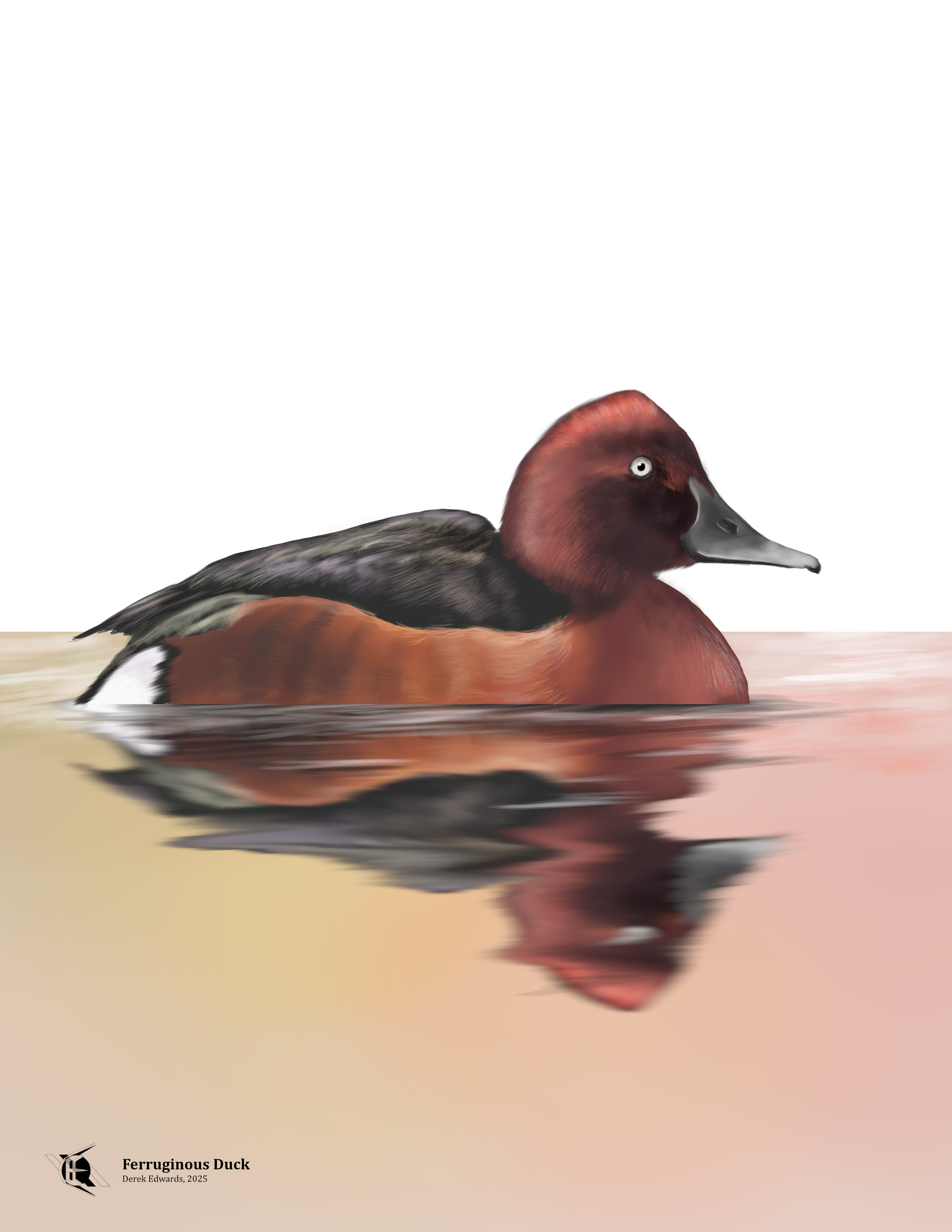 Most birds are brown. Most vertebrates, really. Brown is an odd color; it's not on the color spectrum; it's not a hue. It's the name we give to dull shades of warm hues, those from yellow to red. Brent Berlin and Paul Kay, anthropologists who studied the development of color terms, listed brown as the seventh color named in most languages, getting named just after blue and before other non-hue colors like pink and gray. (I should mention that Berlin and Kay loosened their initial theory, and the fact that a language doesn't have a particular word for "brown" doesn't mean that its speakers don't have a conception of brown).1 Besides being a non-primary color and coming late to our vocabulary, brown has struggled to get much respect from artists. Brown is made from very cheap pigments like umber and ochre, or else by blending together multiple pigments and arguably wasting them. A few artists championed brown, but most prided themselves if they could avoid using it in their works. In more practical uses, brown has served as the color of the poor.2 And yet, as someone who lives in the post-scarcity world of synthetic dyes and digital painting, I think it's time we admitted that brown can indeed be beautiful, and I think there's no finer argument for this position than today's bird, the Ferruginous Duck.