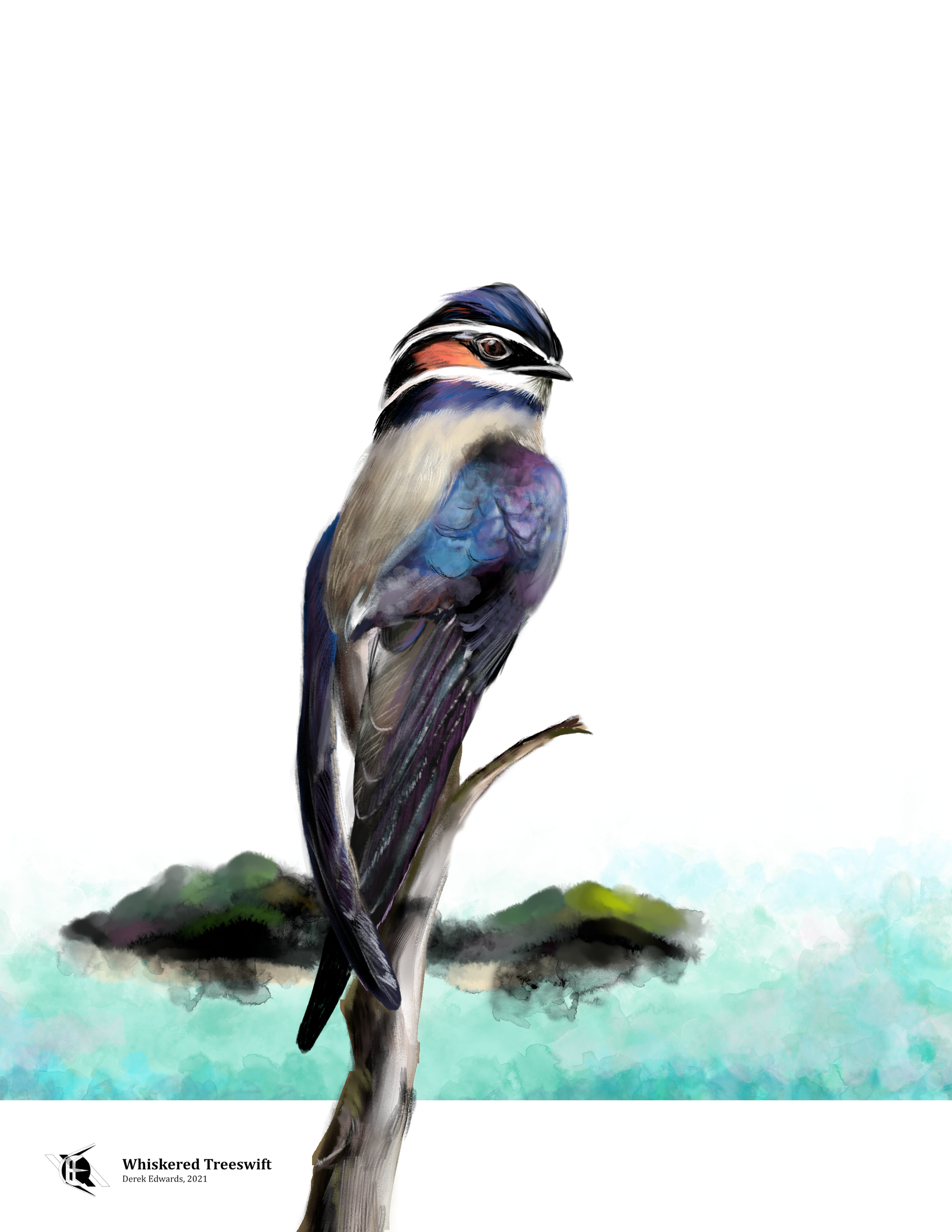 While there are hundreds of swifts, there are only four treeswifts (or crested-swifts, as they are sometimes also called) in the world, all of whom live somewhere in Southeast Asia. They are the mustached, gray-rumped, crested, and whiskered; of these the whiskered is the smallest and most secretive, living exclusively in mature forest and generally keeping below the canopy.