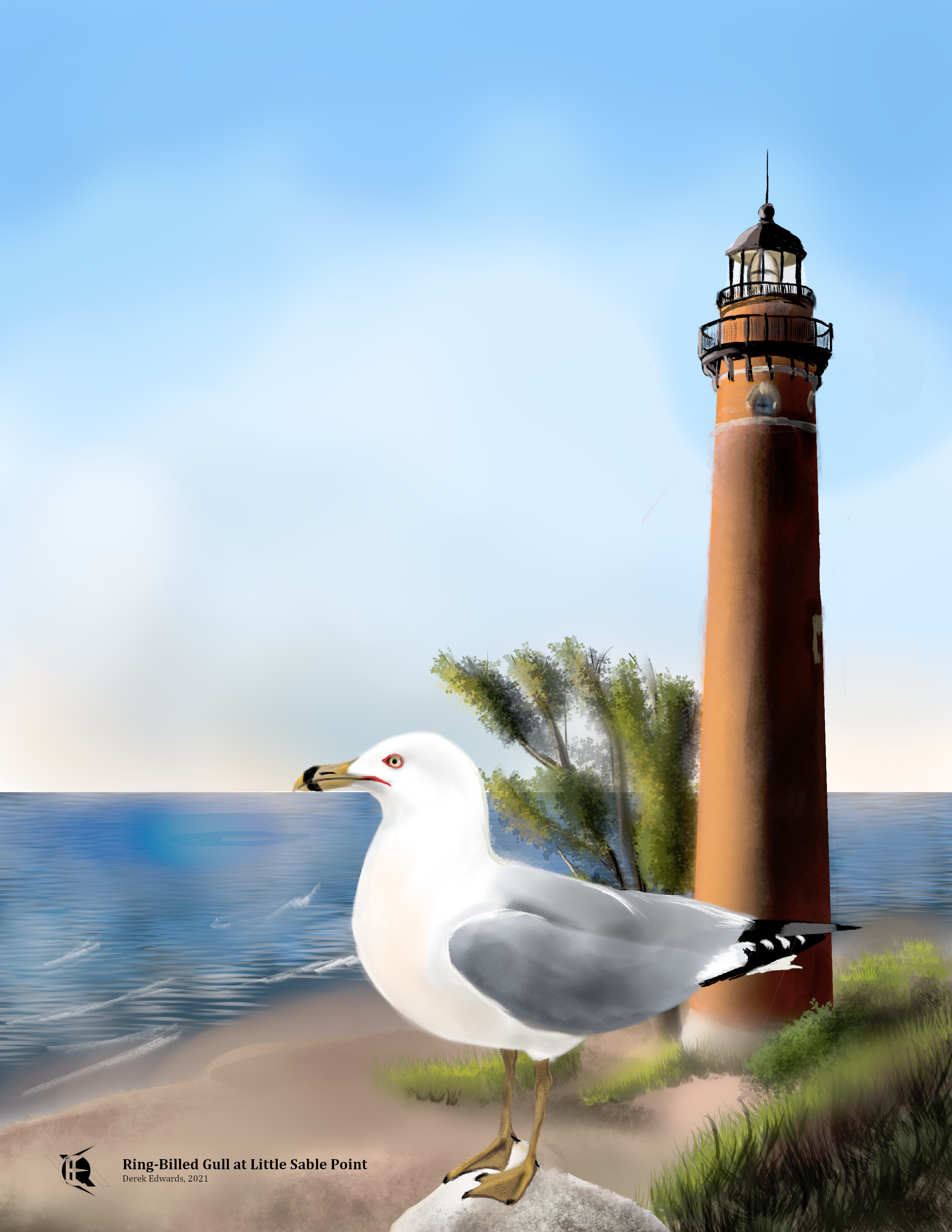 A note about the setting of the picture. Behind the gull you'll see a lighthouse. That is the Little Sable Point light, which marks the westernmost point of Michigan's Lower Peninsula. It was designed by O. M. Poe, a veteran of the Civil War who served as Gen. Sherman's chief engineer during his March to the Sea. After the war, Poe designed many of the lighthouses around the Great Lakes. While it originally had a lighthouse-keeper's residence attached, today only the 107-foot-tall brick beacon tower remains. The lighthouse is typically closed to visitors, though I got a chance to climb up to the balcony when I was a kid. I could not quite see Wisconsin from up there, though I did look.