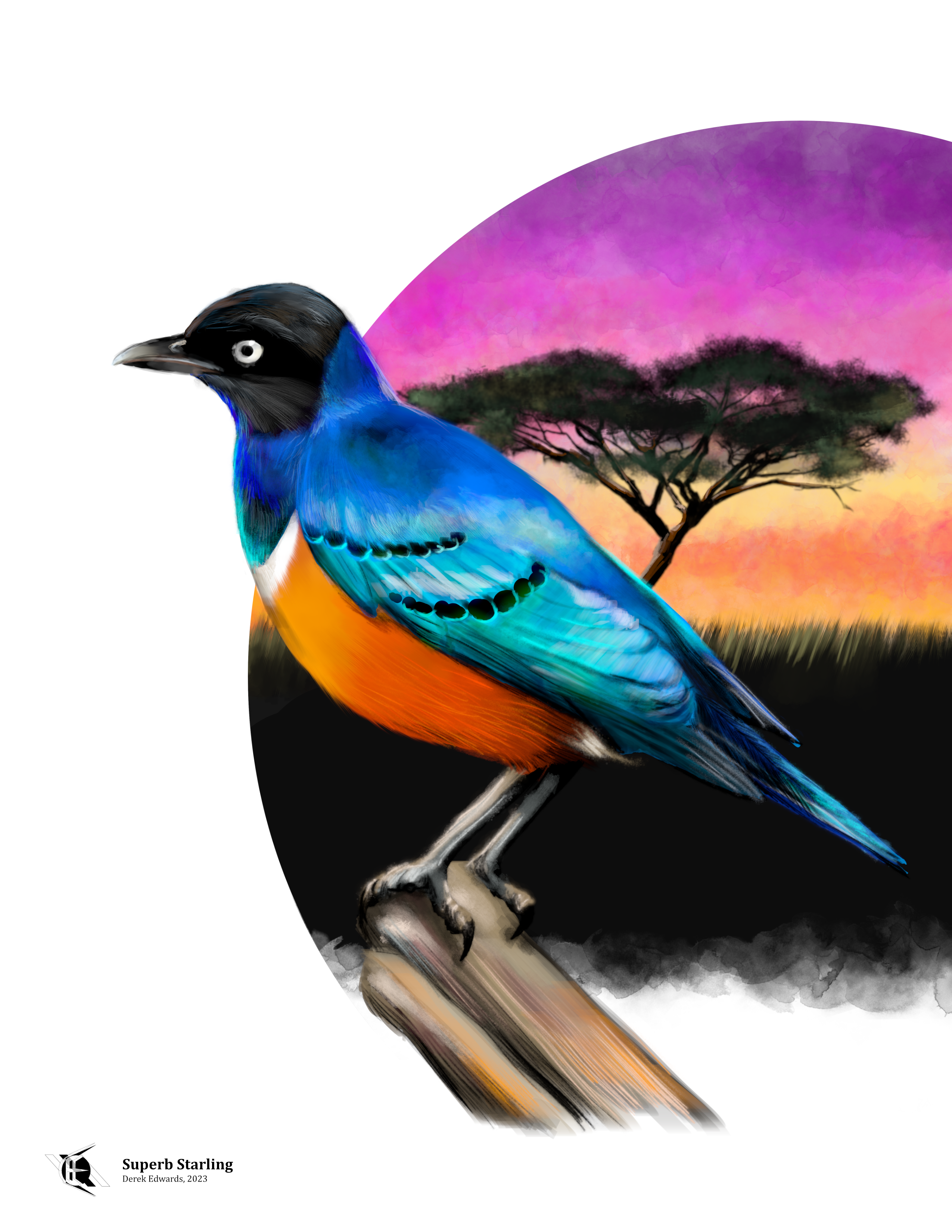 The superb starling is a glossy starling found throughout East Africa. It lives in open woodlands, including the iconic acacia savannahs of the Serengeti. It bears a significant resemblance to Hildebrandt’s starling, which is also found in the region; Hildebrandt’s starling is more purple than blue about the neck and shoulders, and it has red, rather than white, eyes. The superb starling is also differentiated by the white line running across the top of the breast of adults, between the blue and orange feathers.