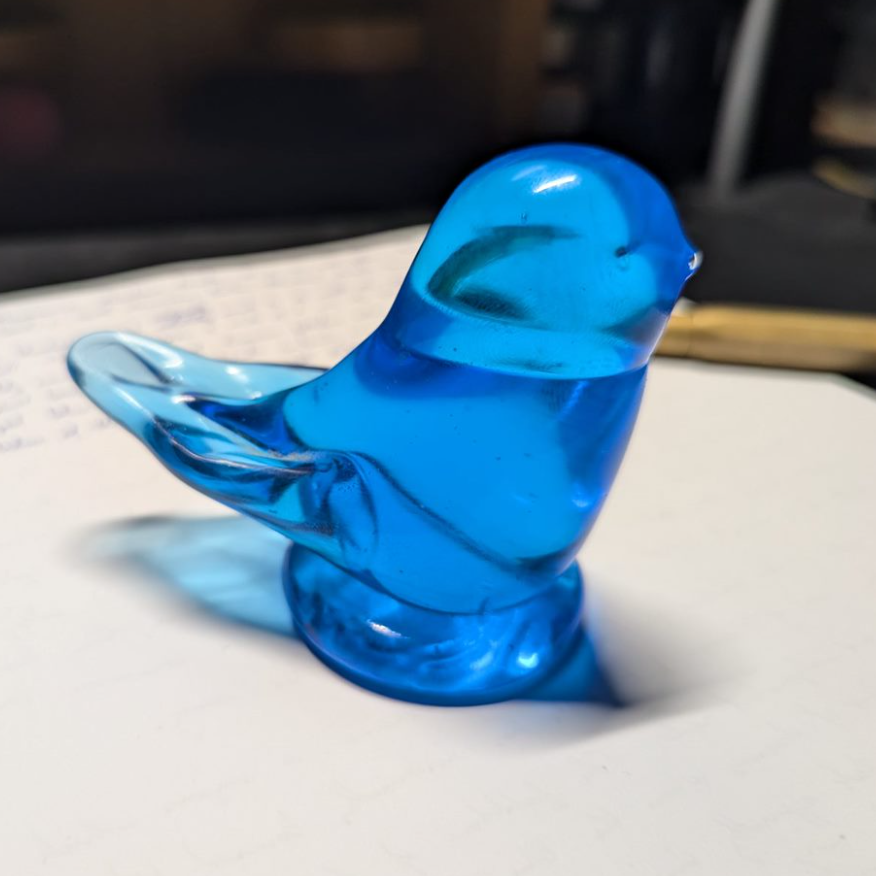 The eastern bluebird was not originally named with a thought of the Blue Bird of Happiness, as far as I can tell. The first European to write of it was the Englishman Mark Catesby,4 who probably was not thinking of Lorraine folklore when he called it the "Blew Bird"; he was just being literal. Bluebirds certainly are blue, at least in back; the male is a deep royal blue that, under the right lighting, can go toe-to-toe with the electric blue of their oft-neighbor, the indigo bunting. Females are less saturated, but similarly colored to males otherwise, both featuring blue backs, orange breasts, and pale bellies. They are thrushes, largely insect eaters and thus not easily attracted to feeders full of seed, and yet their beauty has earned them a place of favor with American birders. Once Maeterlinck's play took off, Americans seem to have just sort of cast their bluebird in the role of his Blue Bird of Happiness, either the eastern bluebird, as in the film, or the mountain bluebird, an all-blue cousin found in the western U.S. which inspired glassworker Leo Ward or Arkansas.5