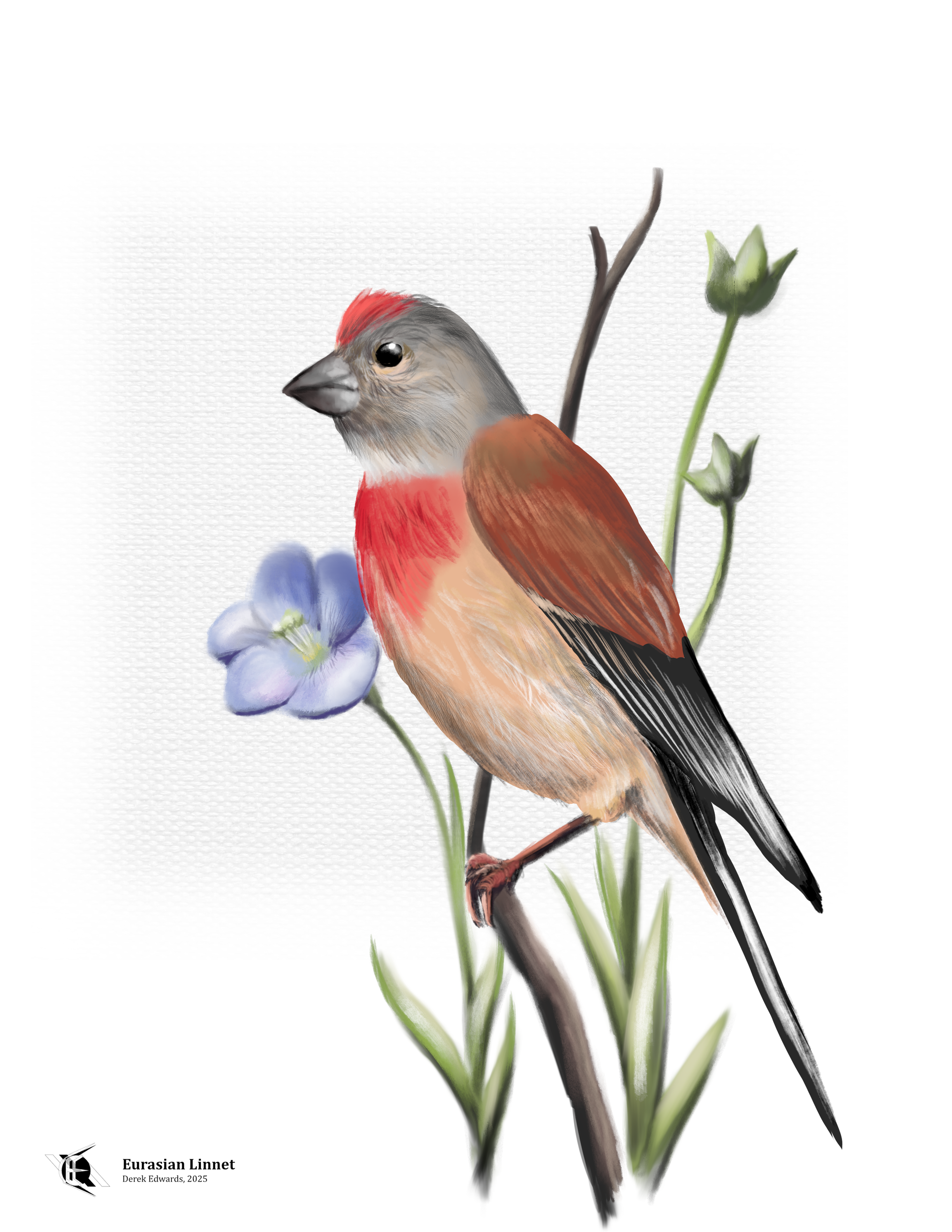 To science the Eurasian linnet is Linaria cannabina. It was originally called Fringilla cannabina by Linnaeus; he was born Carl von Linné, and I’ve found inconclusive answers to whether his family name has anything to do with linne, the Swedish word for linen, but regardless he did not name the finch after flax but rather after hemp, another fiber-crop plant that the birds were associated with; Swedes call the birds hämpling rather than linneling which would be the direct equivalent of the French linette. The Germans call it bluthänfling, roughly translating as “bloody hemp critter”, but that didn’t stop the German naturalist Johann Matthäus Bechstein from later placing the linnets in a genus named for flax.8