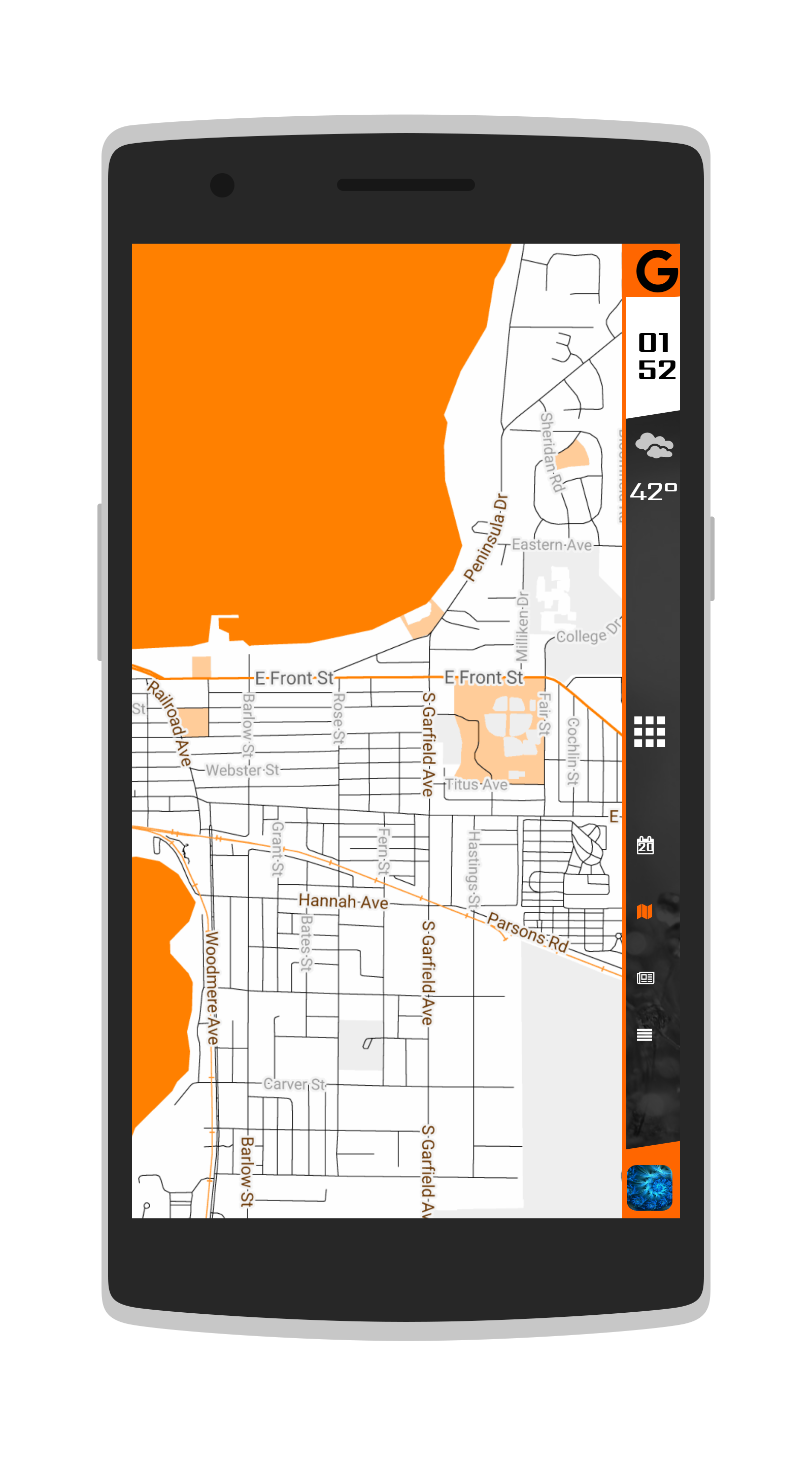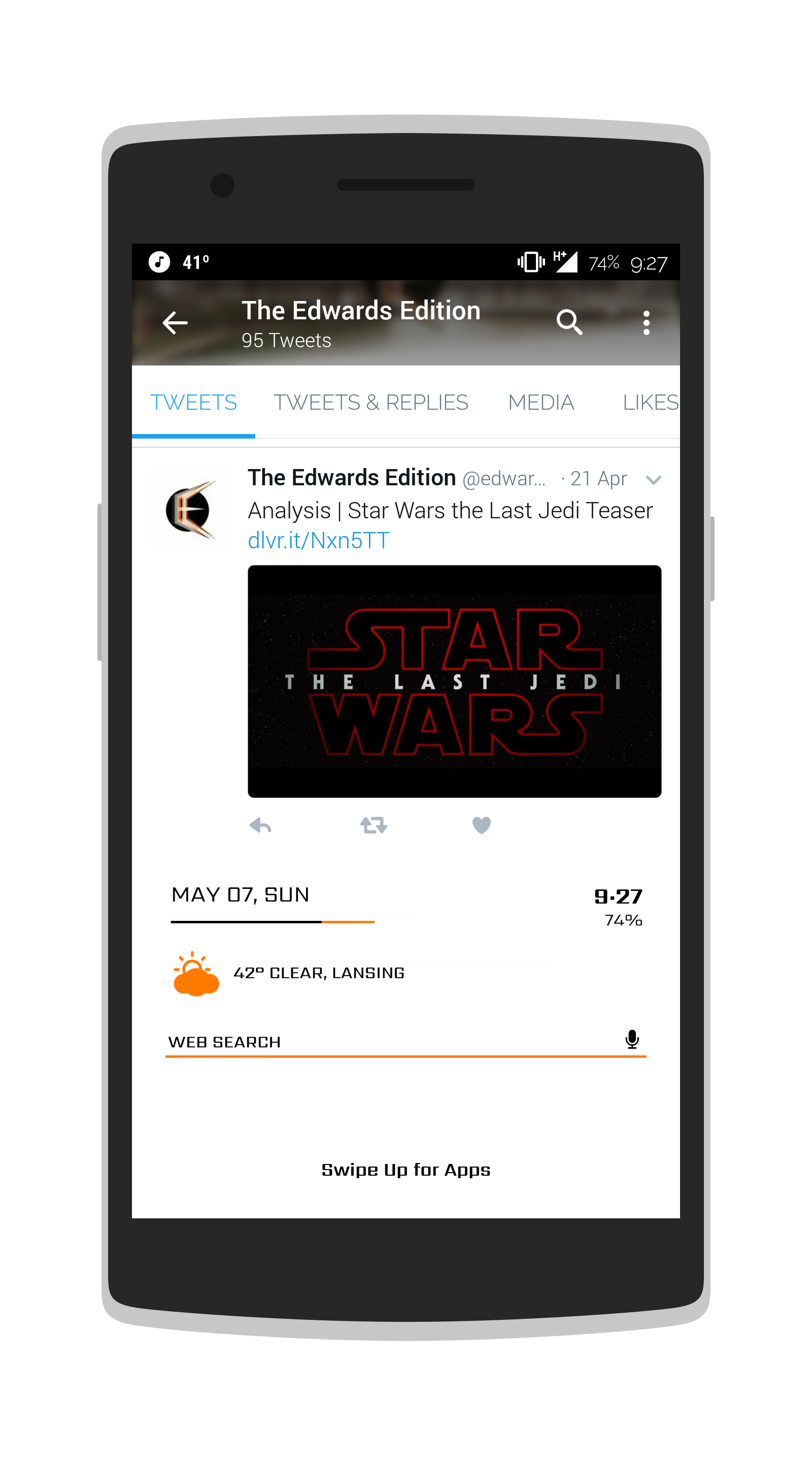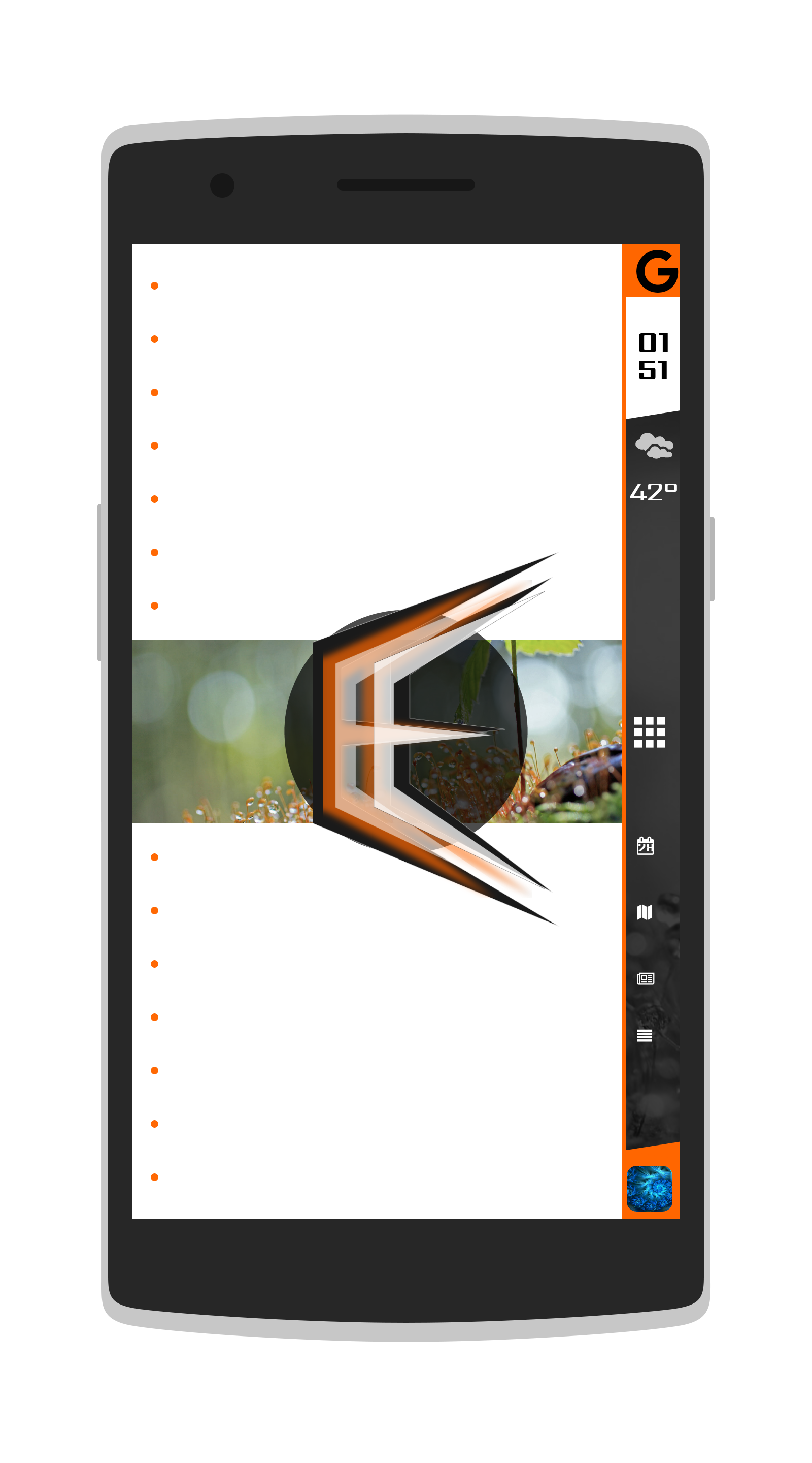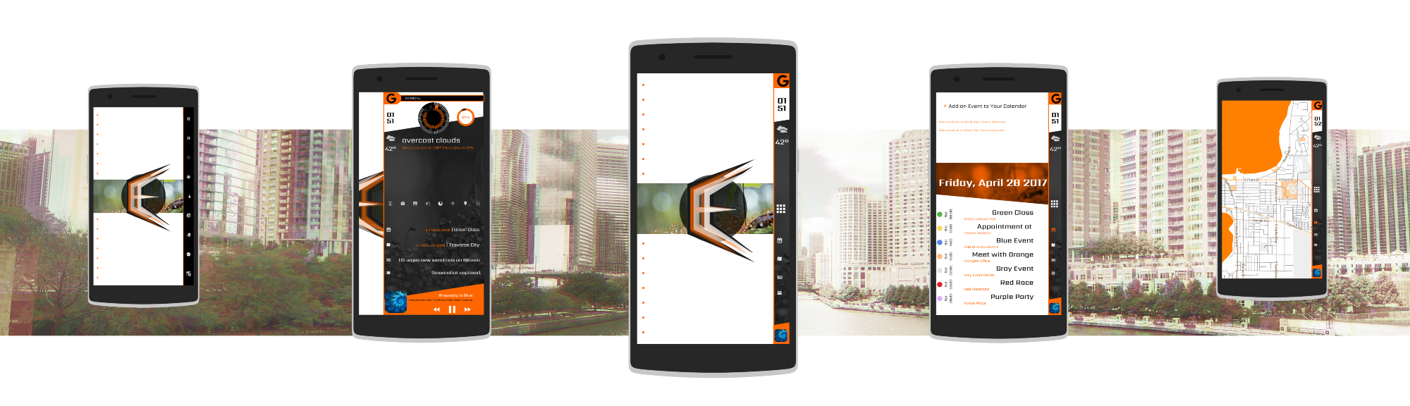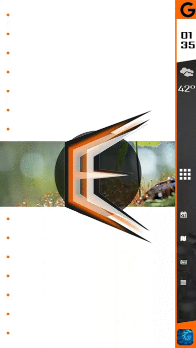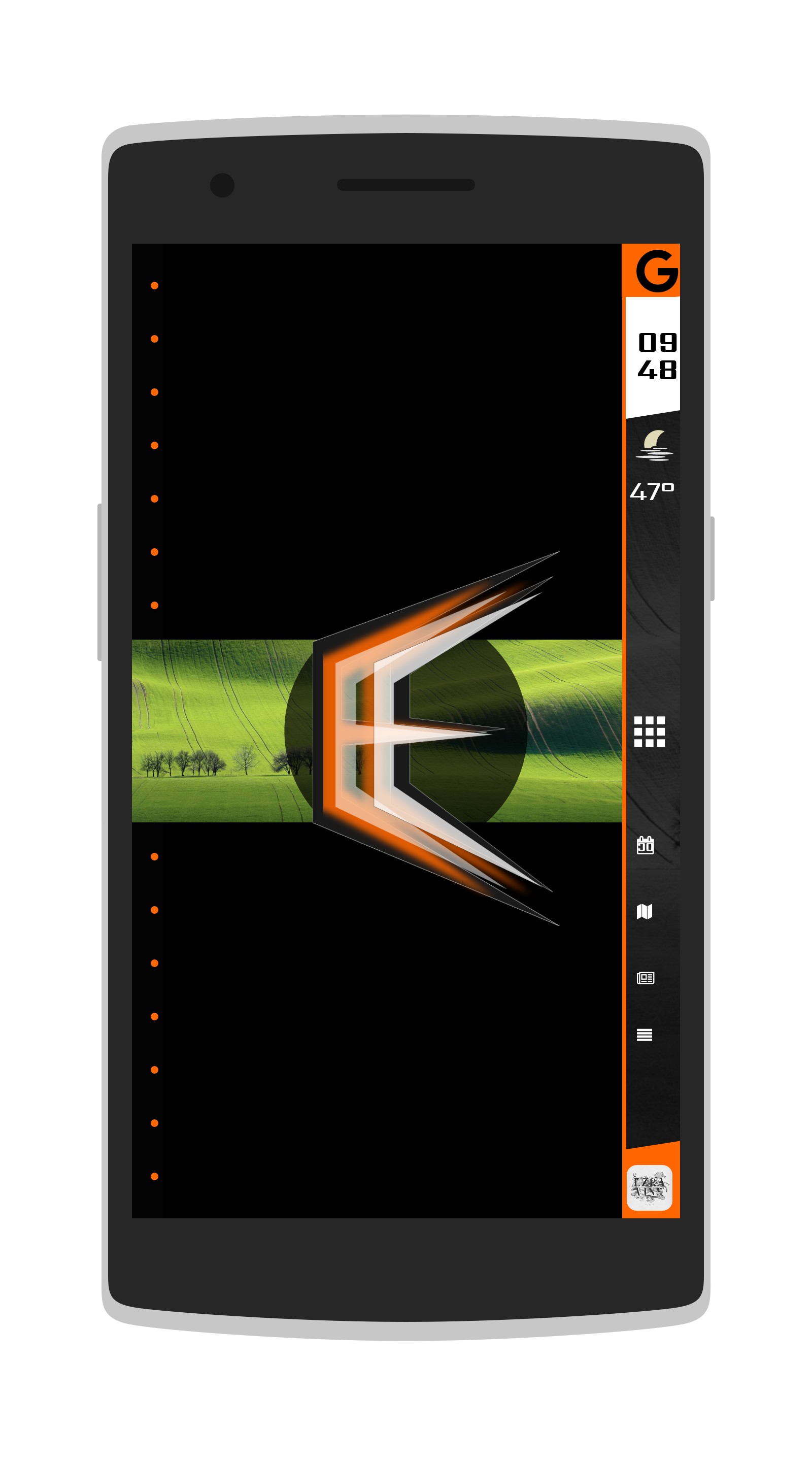 My setup is built for a two-page launcher configuration, with the main screen being the left screen. The main screen features the Edwards Edition emblem, with the orange portion having a loop-with-return fade out animation that causes it to pulse between 100% and 50% opacity.