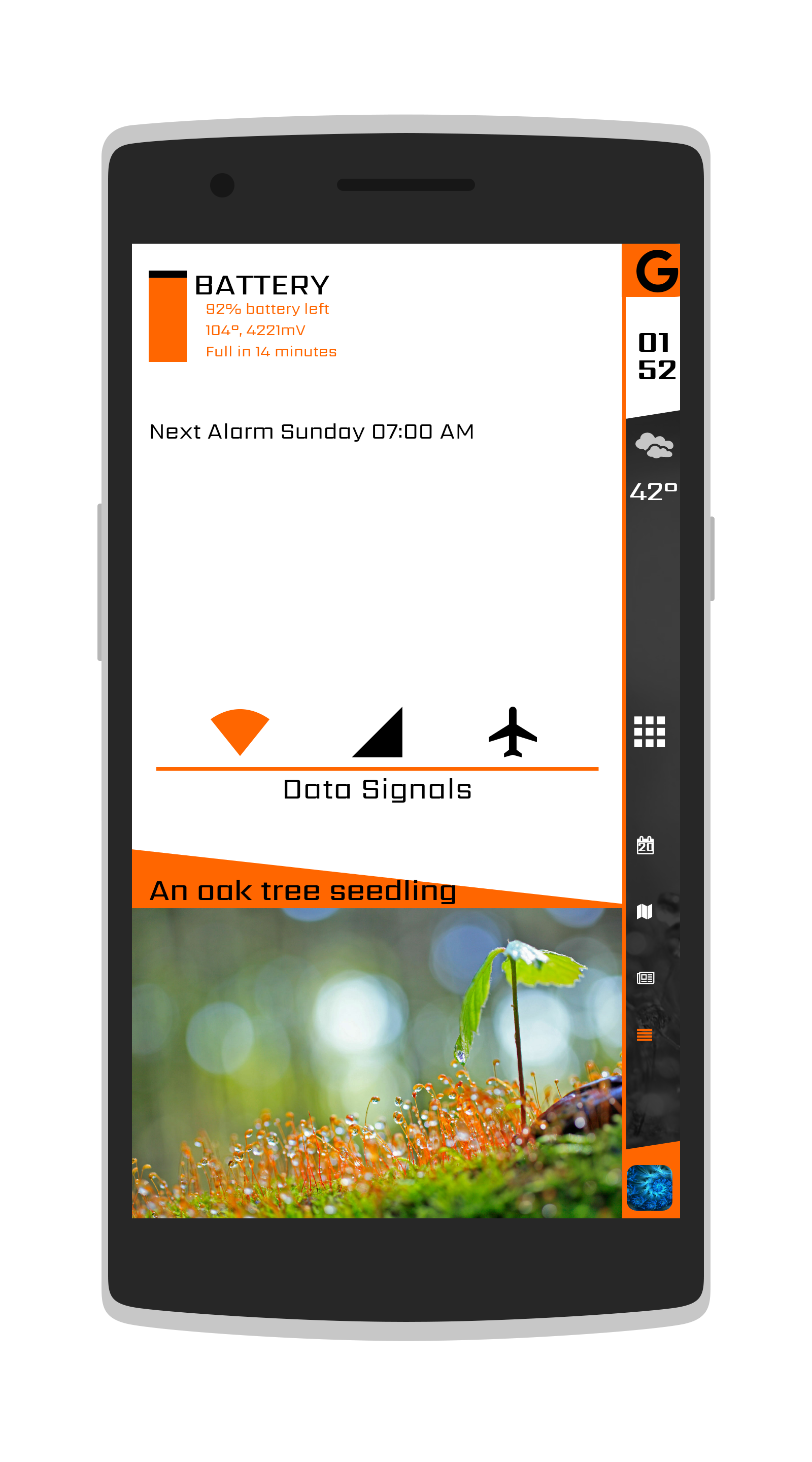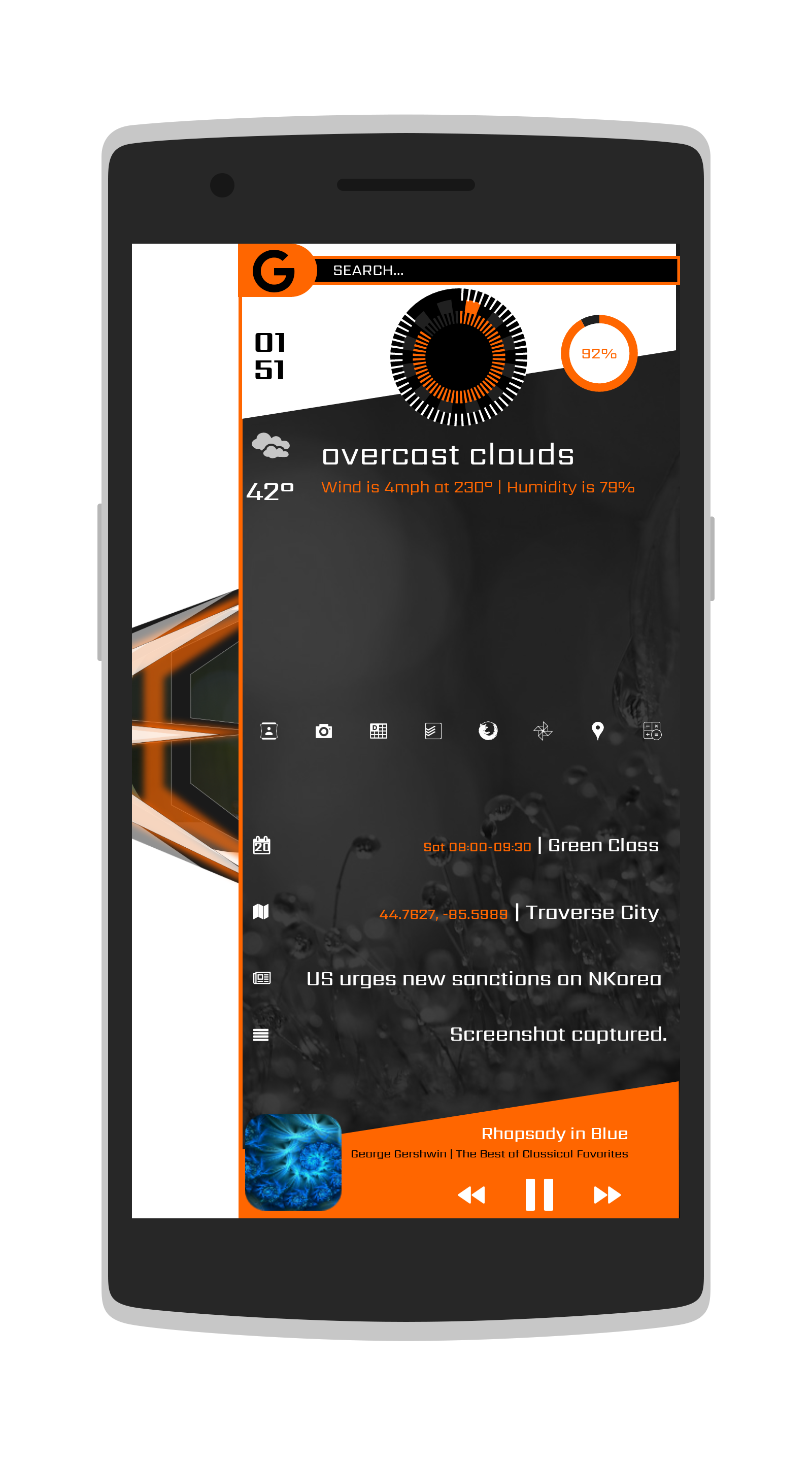 At the top is a search bar, which opens the Google app. Below this are a battery status display, an analogue clock display (made with several co-centric progress circles) and a digital clock display, which is visible from the main page. Below these is a display of weather conditions.