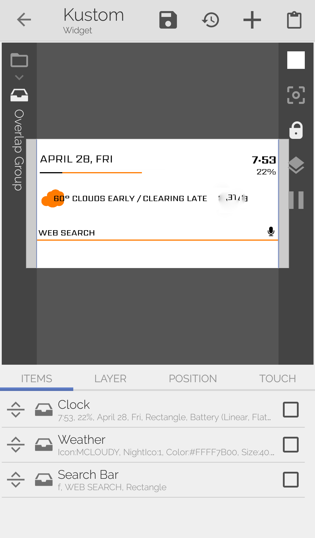 Widgets and wallpapers are built from items, which can be positioned in relation to center or edges of the item container. Items can also be given touch actions, allowing for the launch of apps or shortcuts, control of music playback, or switching of global variables. This sounds more complicated than it is, really.