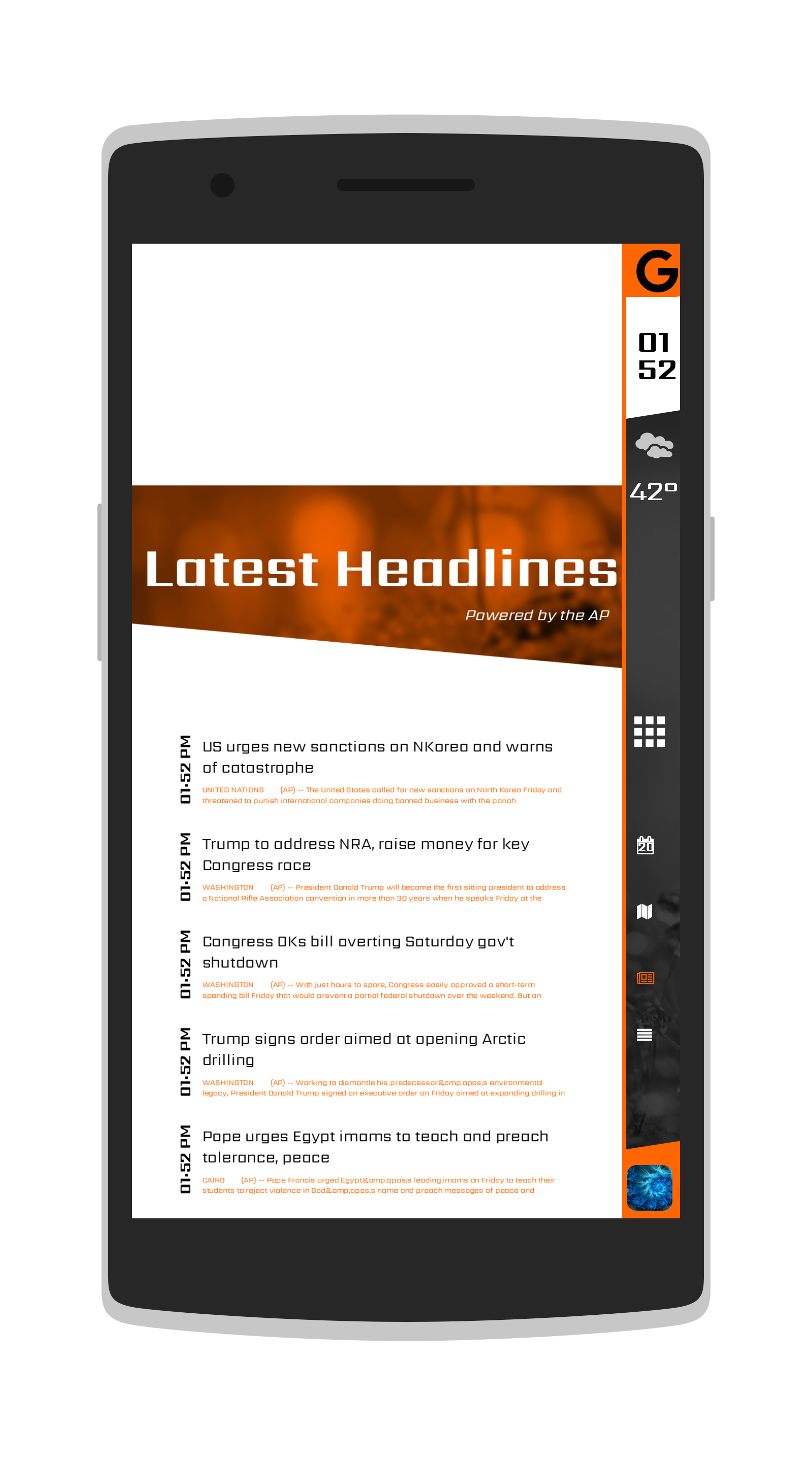 The bottom half of the sidebar contains text readouts concerning the contents of the side panels mentioned earlier: The time and name of the next event, the latitude, longitude, and name of the current location, the top AP headline, and the first notification, if any.