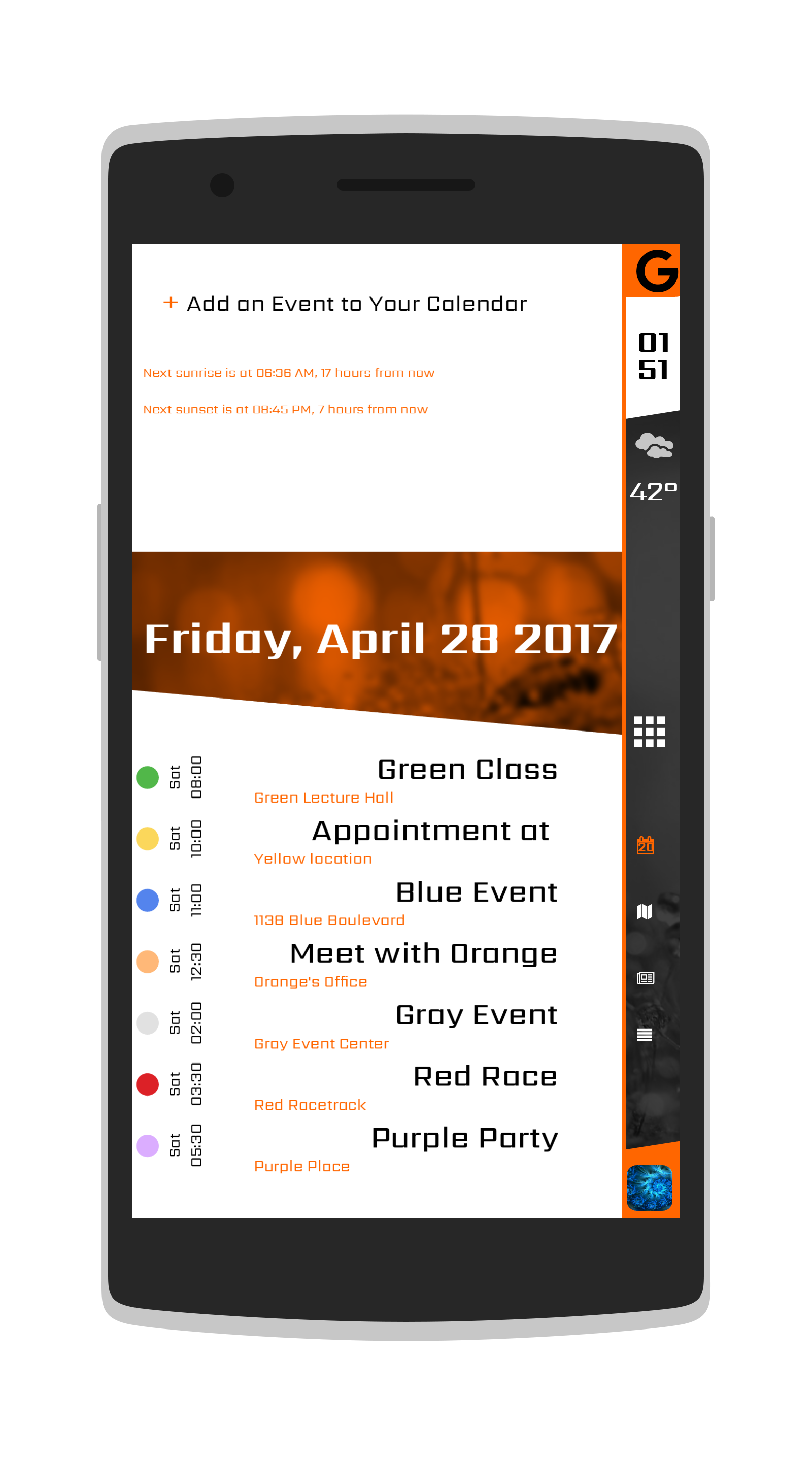 The rest of the setup exists as four side panels. The first displays the date, the next seven calendar events, sunrise and sunset times, and gives the ability to add a new event. The image behind the date is the Bing photo, tinted orange and blurred by 30%.